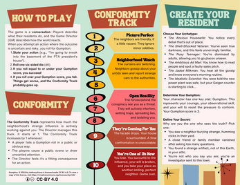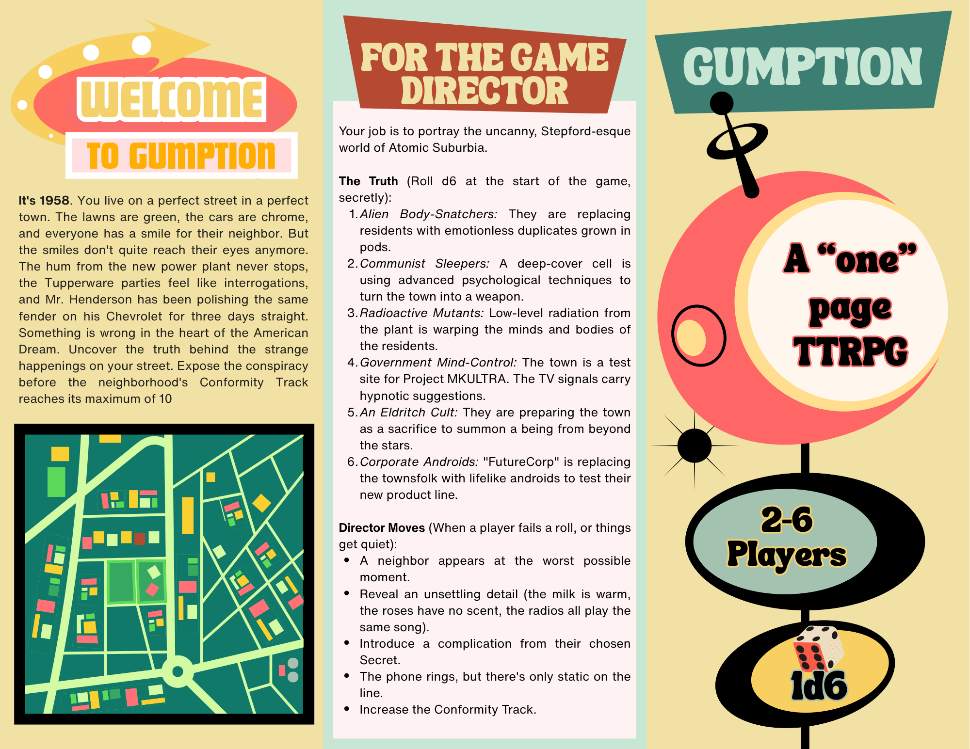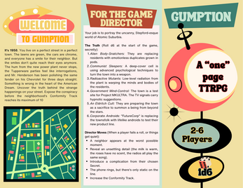 Gumption is a complete, one-page tabletop RPG of Cold War paranoia, suburban dread, and B-movie conspiracy.